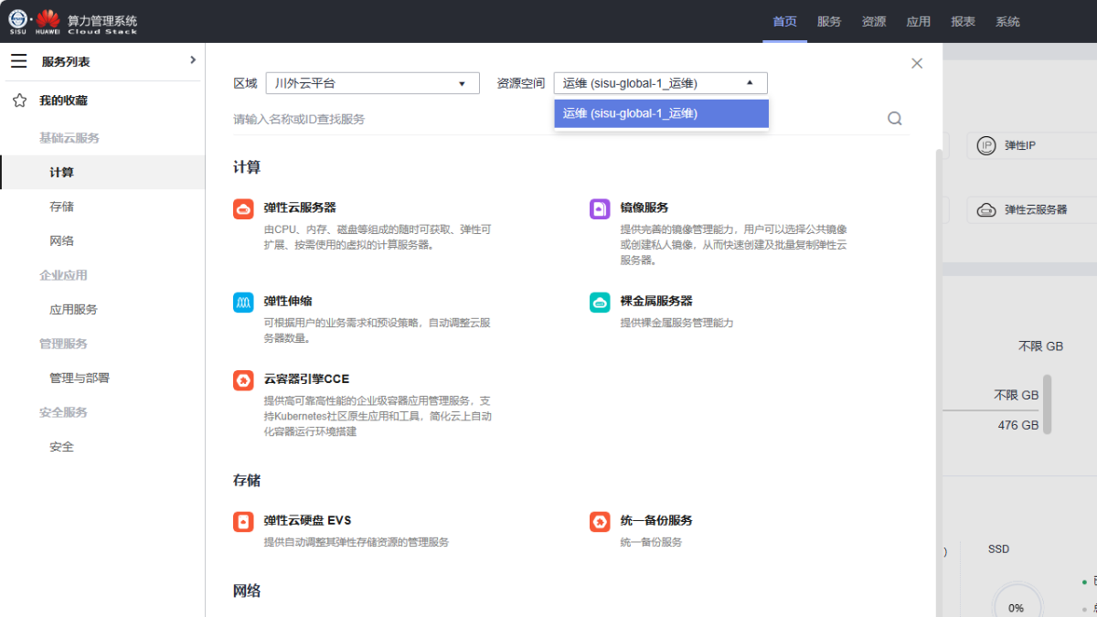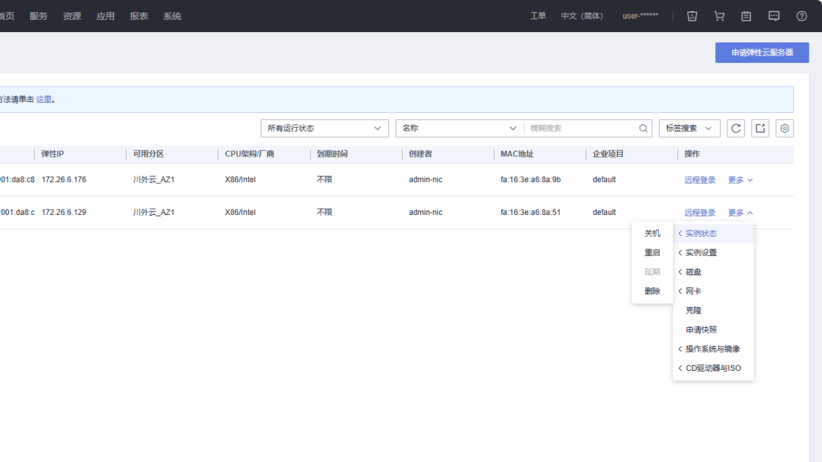 〇、注意 在校园网内(含在校园网外登录aTrust后)才能对云服务器进行管理操作。 维护云服务器内业务系统时,建议通过Windows远程桌面或者SSH客户端连接云服务器校园网IP(弹性IP)。当上述方式连接不上或者需要进行快照操作时,请参考本文进行操作。 一、登录云数据中心算力管理系统 在校园网内访问https://console.hcscloud.sisu.edu.cn/,以业务系统管理员或运维人员账号登录算力管理系统。 二、访问云服务器控制台页面 点击页面左上角“≡”图标,在“资源空间”栏选择目标业务系统,再点击“弹性云服务器”,随即跳转至云服务器控制台页面。